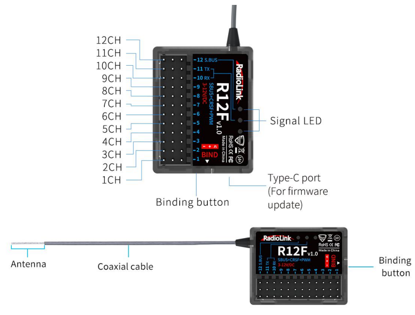 RadioLink R12F, 12-channel receiver, 2.4G FHSS spread spectrum algorithm and 67-channel pseudo-random frequency hopping, supports PWM, SBUS and CRSF signal. It is high voltage servo supported and can get the new functions by updating the firmware. R12F is compatible with RadioLink T16D/T12D/T8FB/T8S/RC8X/RC6GS V3/RC4GS V3/RC6GS V2/RC4GS V2/RC6GS/RC4GS transmitters.