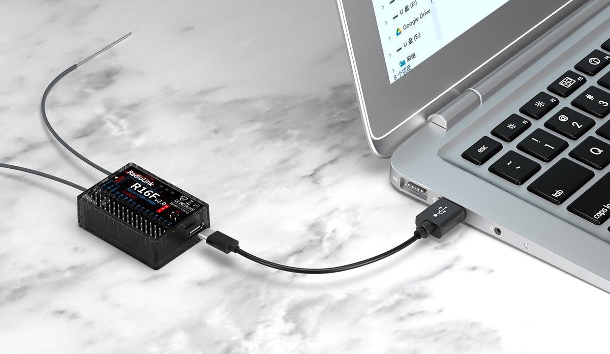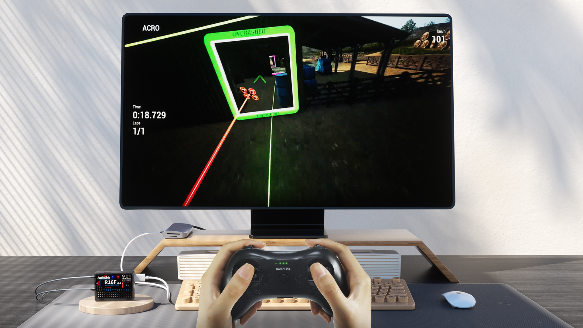 R16F接收机内置PC Game Joystick通信程序(需先将固件升级到V1.7版本),可直接通过接收机的Type-C口连接电脑玩模拟器,支持TRYP FPV、AeroFly、Uncrashed、liftoff、FPV LOGIC、Velocidrone (黑羊模拟器)等最新开源模拟器,无需外接供电。且苹果电脑和Windows系统电脑均可以使用。