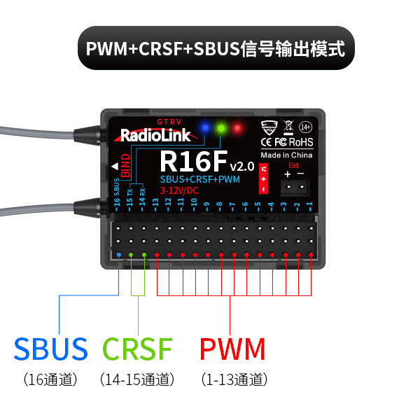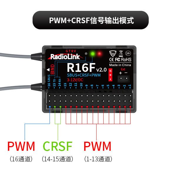 PWM+CRSF双信号输出模式:接收机绿色和红色指示灯同时常亮时,1-13、16通道输出PWM信号,14-15通道输出CRSF协议。