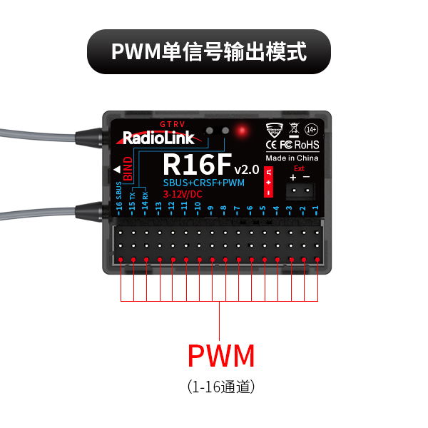 PWM单信号输出模式:接收机红色指示灯常亮时,1-16通道输出PWM信号。