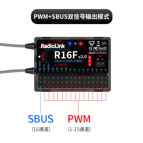 PWM+SBUS双信号输出模式:接收机蓝色和红色指示灯同时常亮时,1-15通道输出PWM信号的同时在第16通道输出SBUS信号。