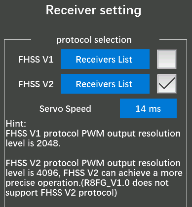 Please click "Receivers List" (as shown above) to check whether the receiver you are currently using belongs to FHSS V1 or FHSS V2 protocol list. R4FGM V1.0 only supports FHSS V1 protocol, not FHSS V2 protocol; R4FGM V2.0 and later versions support FHSS V1 and FHSS V2 protocol. Before operating the model, please make sure protocol of the receiver is selected correctly, otherwise some functions will not work properly.