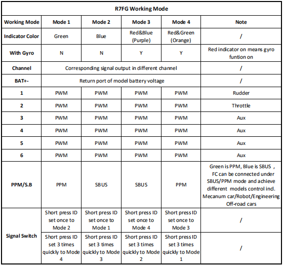 When the green indicator is on, Ch1 to Ch6 output standard PWM while Ch7 outputs PPM. Short press binding button (ID SET) once to change Mode 1 to Mode 2 and three times within 1 second to Mode 4.