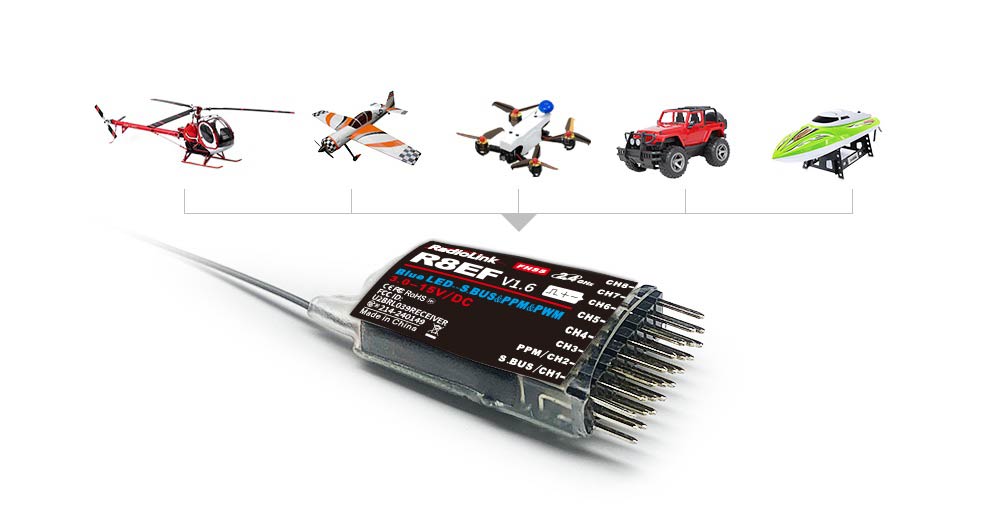 Supports high-voltage servos. Compatible with RadioLink drone/airplane transmitters T16D, T12D, T8FB, T8S; and car/boat transmitters RC8X, RC6GS V3, RC4GS V3, RC6GS V2, RC4GS V2, RC6GS, RC4GS series.