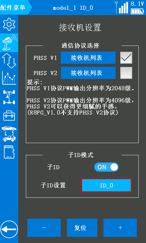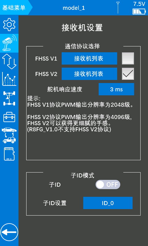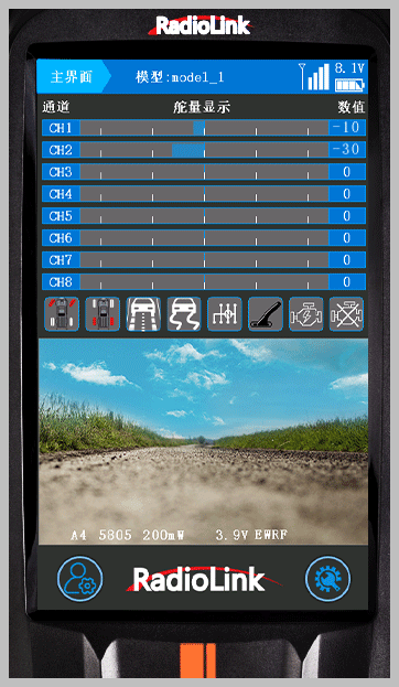 信号强度及接收机电压在遥控器和接收机通电对码完成之后即可在主屏幕上显示。