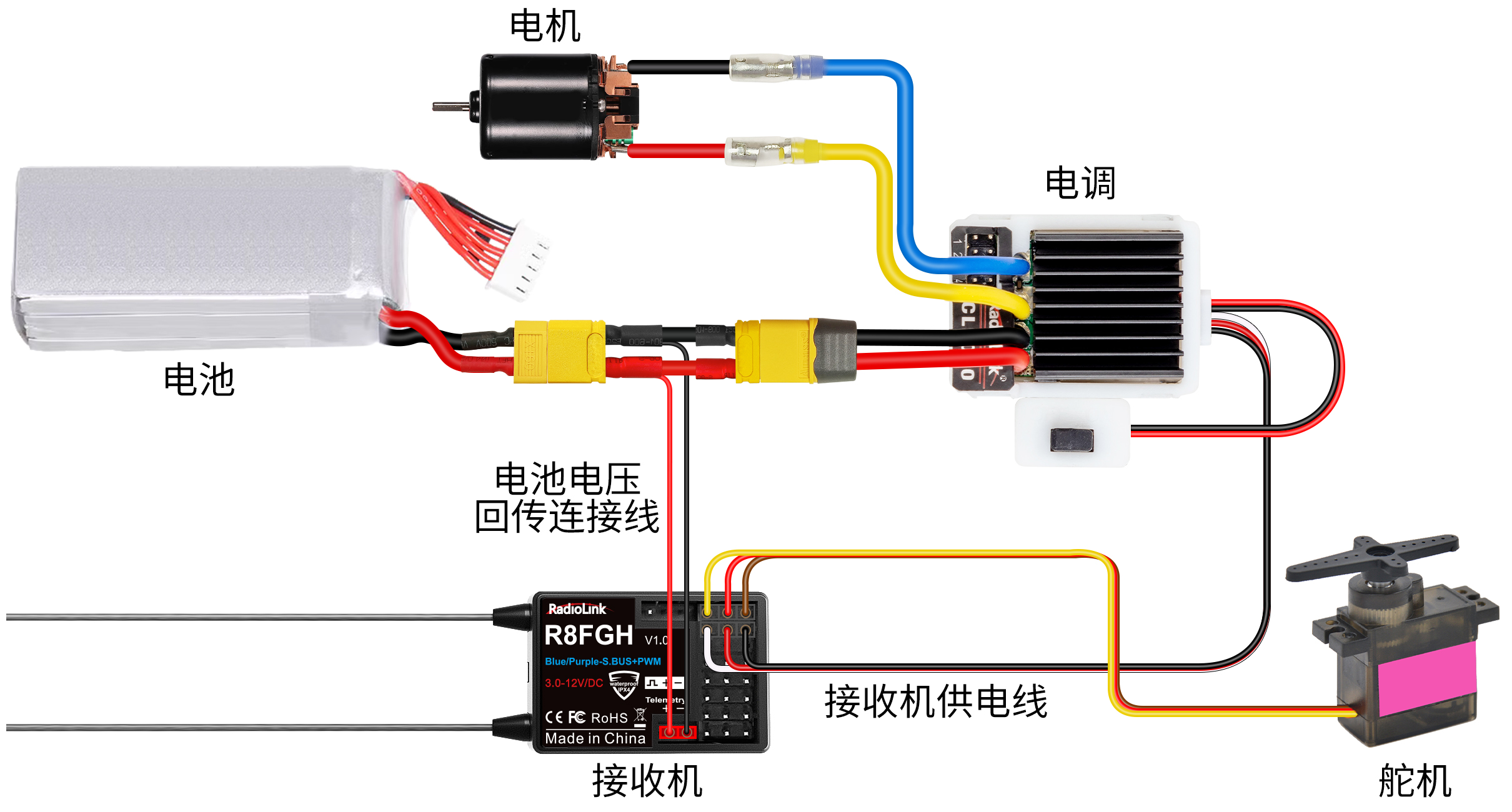 动力电压信息只需将标配的动力电池电压连接线连接至接收机的Telemetry口(即动力电池电压回传接口)即可显示,