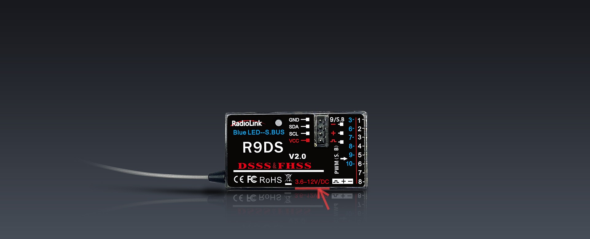 PWM信号模式:接收机指示灯为红色,R9DS 输出9 个通道的普通 PWM 信号,参考接收机贴纸上的白色字标注。
