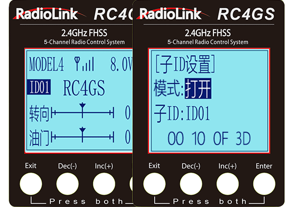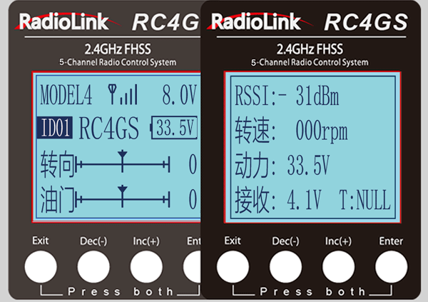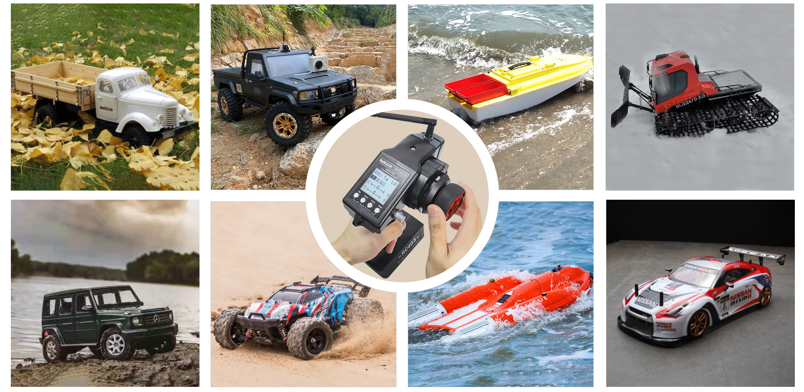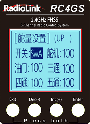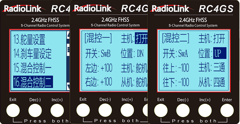 一通方向、二通油门、辅助通道三至五通道旋钮、点动开关、拨段开关均可自设,可设置任意两通道之间混控。