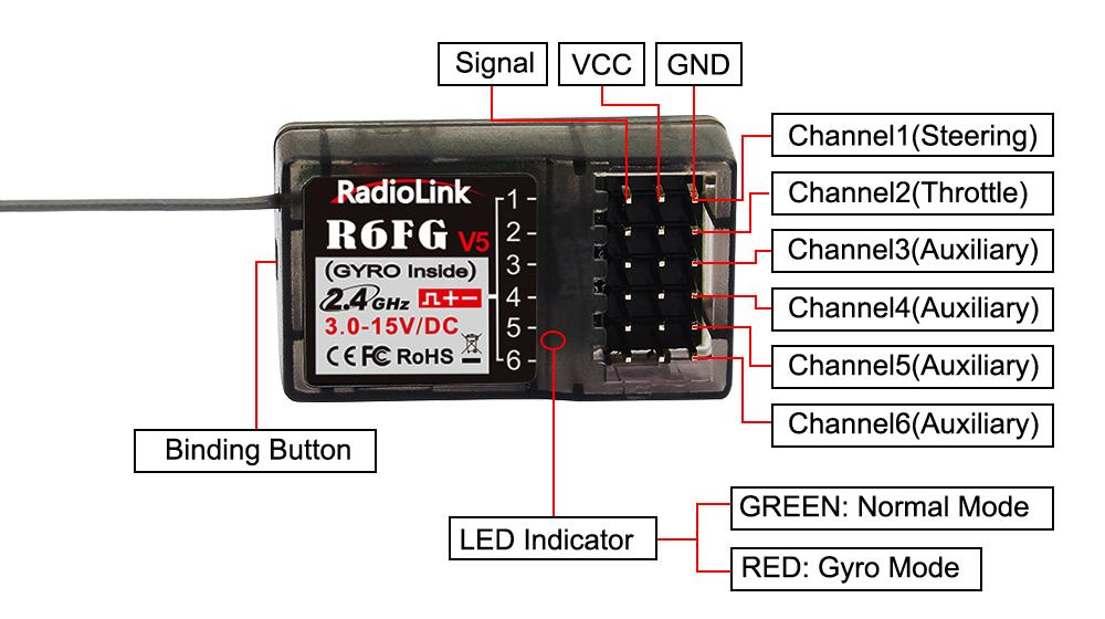R6FG has two working modes:normal working mode and gyro working mode. Short press the binding button (ID SET) three times with interval less than 1 second to switch the working modes.