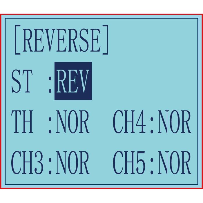 This function reverses the direction of operation of the servos related to transmitter steering, throttle, channel 3, channel 4, and channel 5 operation.