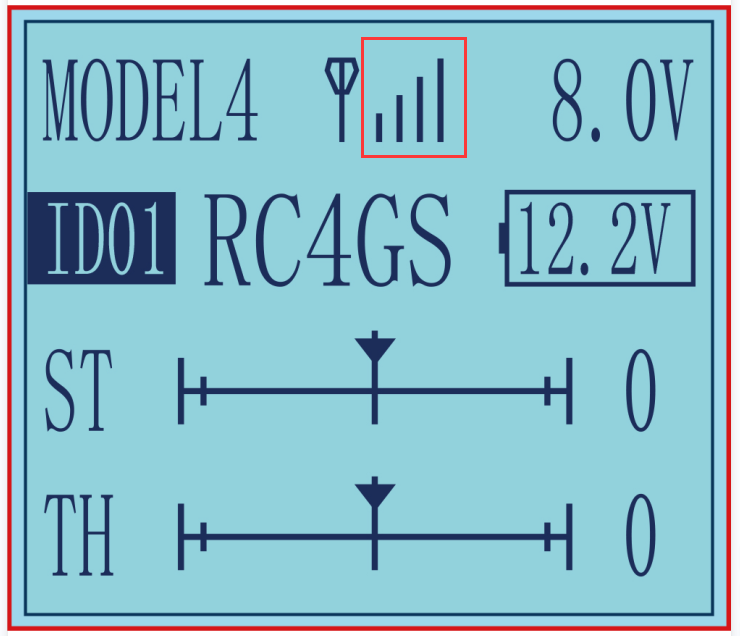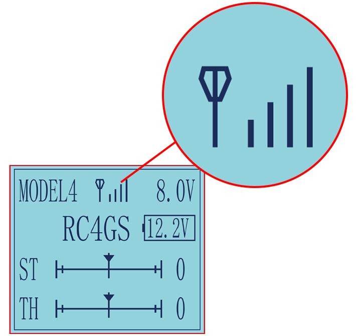 RC4GS V3 and R6FG have already finished binding by default. Turn on the RC4GS V3 and the R6FG, the signal tower will be displayed on the top of the screen as in the picture right, which means the transmitter and receiver have finished binding.
