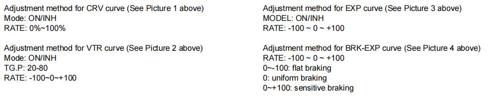 The gyro sensitivity can be adjusted in the BASIC MENU-- GYRO in the transmitter. VR and STD modes are optional. Gyro sensitivity setting is CH3 by default (factory setting) and can be adjusted by VR knob. If VR knob or channel 3 is used for other functions, select STD mode and adjust the gyro sensitivity by buttons Dec(-) or Inc(+) . Percentage is displayed when sensitivity is adjusted while the bigger percentage means higher sensitivity.