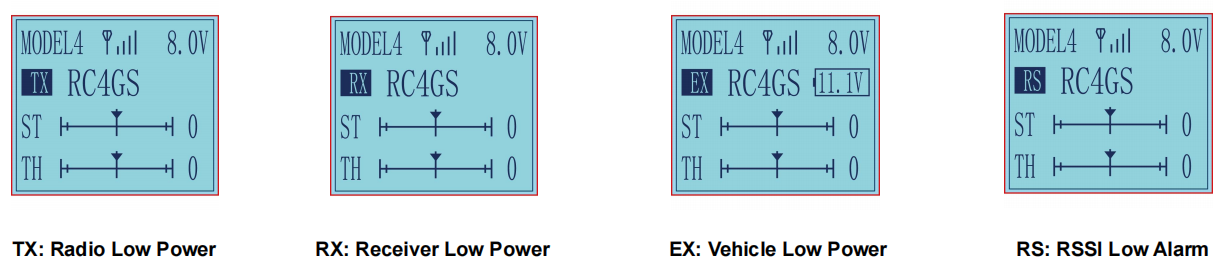 When the voltage of the transmitter, receiver, vehicle battery, and RSSI signal strength are lower than the set value, there will be a text displayed on the transmitter screen(See Pictures below) and a "didi" sound dual alarm prompt to remind you.