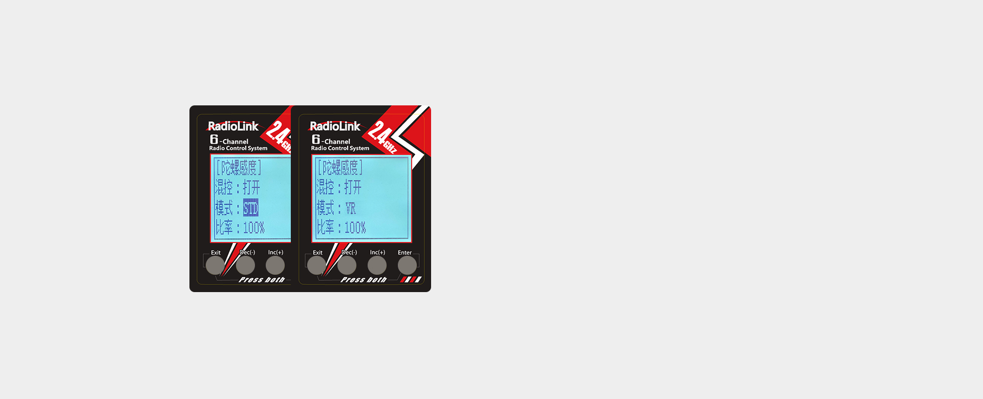 两种方式设置陀螺仪感度,便捷顺心,让陀螺仪自稳功能发挥更出色。可选择通过“STD”或者第三通道VR开关来开启或关闭陀螺仪感度。