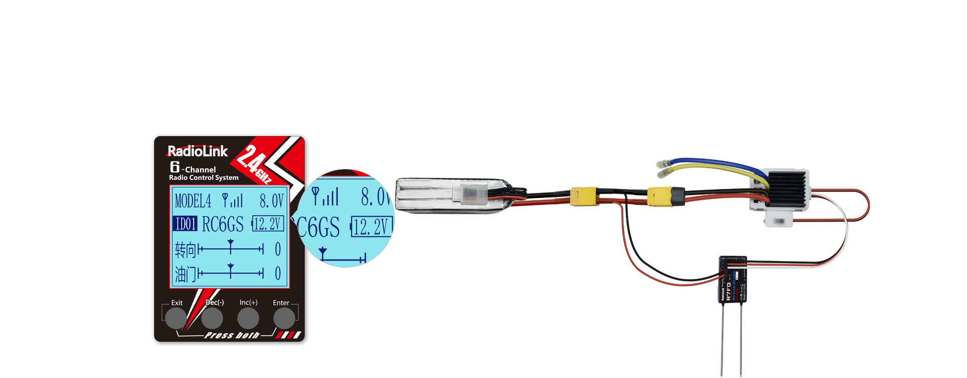 RC6GS V2除了出厂标配的R7FG接收机,还支持4通道蚊车版MINI接收机R4FGM/R4F,6通道接收机R6F/R6FG、8通道船用接收机R8EF/R8F。