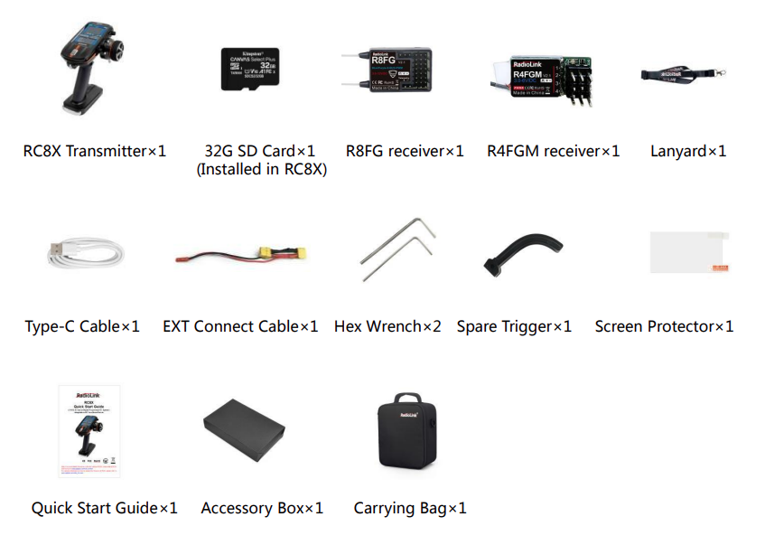 A 32G SD card will be packed with RC8X, it can be used for transmitter upgrade or save the font, icon, screenshot, sound, and other customized files you have designed for your RC8X.