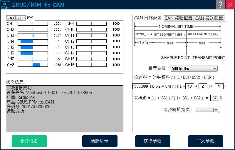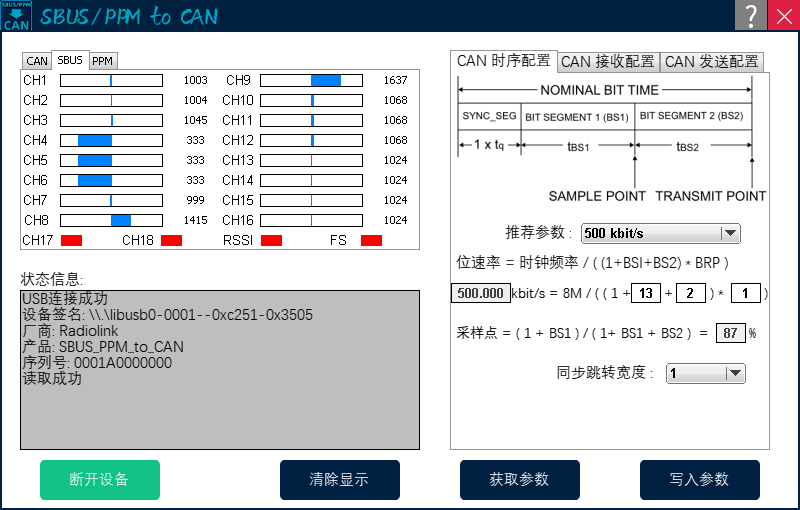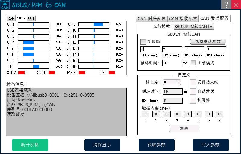 电脑APP不仅可以设置CAN协议,还可同时观看CAN,SBUS和PPM数据,排查问题简单明了。