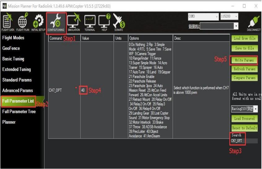 CONFIG/TUNNING - Full Parameter List- Input CH7_OPT in the search column at the lower right corner and press Enter. As the searched CH7_OPT shown in RadioLink Mission Planner, change the value to 40(Object Avoidance) then click Write Params on the right to save.