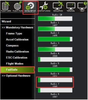 Choose a 2-way switch to control CH7 and click INITIAL SETUP- FailSafe, then the PWM value of CH7 is shown. When toggling the switch, if the PWM value of CH7 is more than 1800, it means the avoidance function is enabled. If the PWM value of CH7 is less than 1200, it means the avoidance function is disabled.