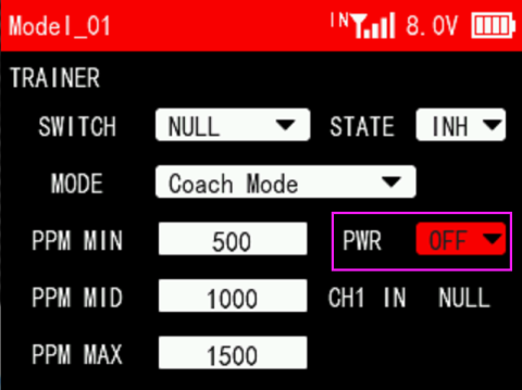 A: T16D/T12D with hardware V1.0.2 or above has PWR option on TRAINER menu. PWR is needed when T16D/T12D works as a trainer transmitter and a Type-C wireless trainer cable is used. For more details, please refer to the link of T16D/T12D trainer function setting methods: