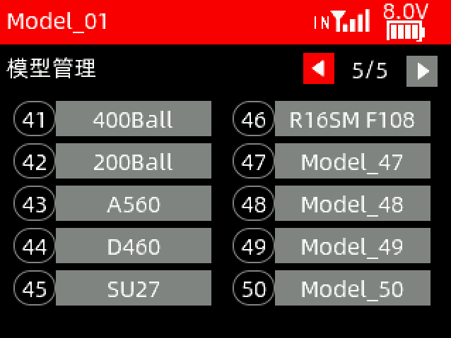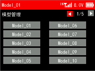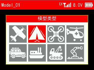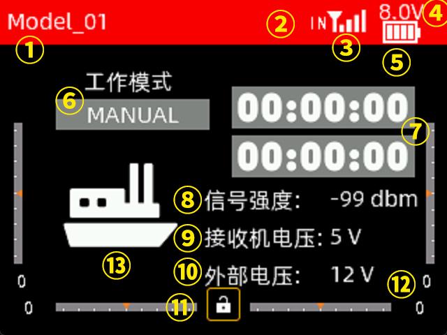 ① 当前使用的模型名称。您可以在遥控器设置--模型管理界面选择不同的模型,T12D最多可以支持50组模型存储,操作模型之前,一定要查看显示屏上的模型是否和实际使用的模型一致。如果选错模型,舵机的动作、大小、方向和中立位设置会发生错误,此时操作遥控器,将可能会导致模型受损。