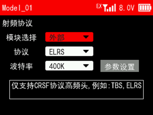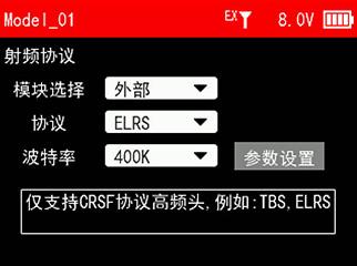选择高频头对应的协议和波特率(具体请看所用高频头的说明书),例如:ATA ELRS 1W高频头的协议为ELRS,波特率可选默认的400K,然后进入参数设置。