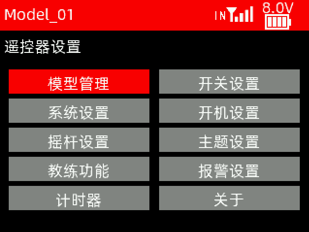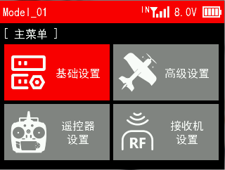 当遥控器没有连接任何外部模块时,“模块选择”选为内置,当选择内置时,遥控器顶部任务栏信号塔旁会显示IN。