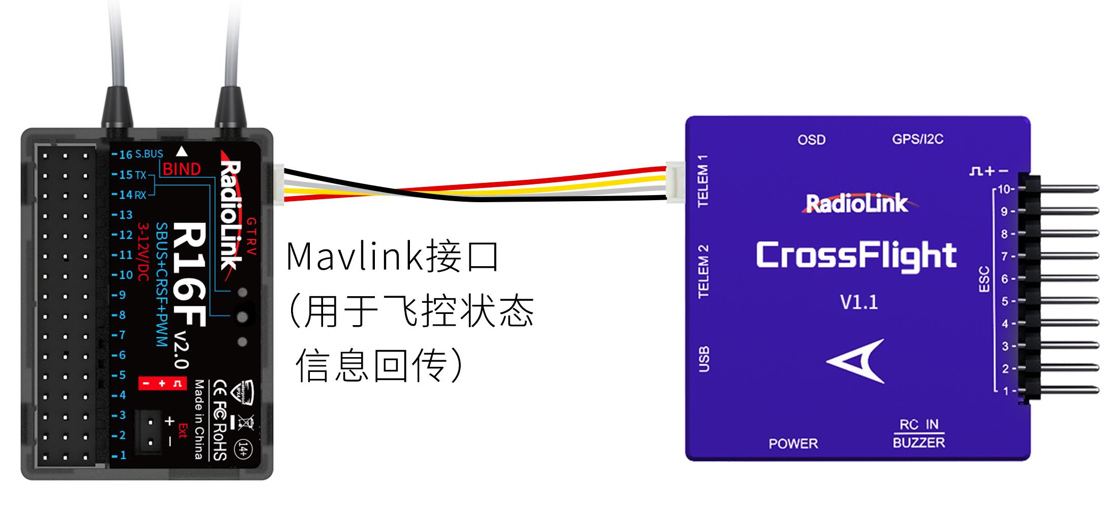 当T12D和飞控以及GPS一起使用时,将R16F的Mavlink接口连接至飞控的TELEM接口,以飞控的TELEM1为例(R16F标配下图的连接线):