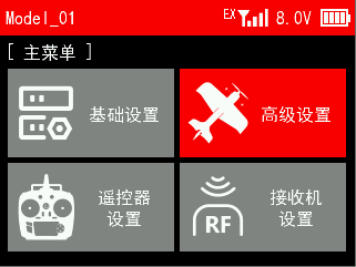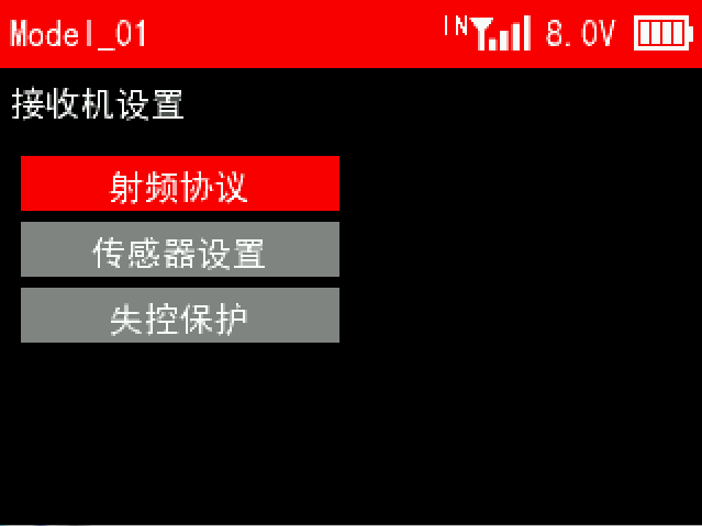 此章节介绍遥控器 [主菜单] 里的接收机设置所有功能,包括射频协议、子ID功能、传感器设置和失控保护。