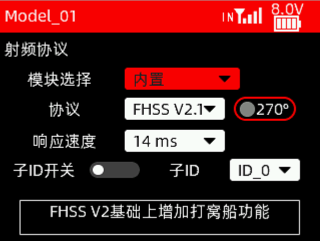 270°:270度舵机。当选择为FHSS V2.1协议,且使用的是270度舵机时,可开启该选项。