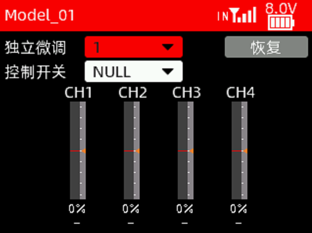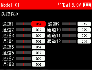 失控保护功能是一项重要的安全设置,当接收机失去信号不受控制时可用来保护模型不受损失或降低损失程度,也可对人员安全起到一定的保护作用。此功能可设置当接收机失去控制时各个通道执行的输出值。所有通道默认为0%,可根据设备使用需要自定义设置。