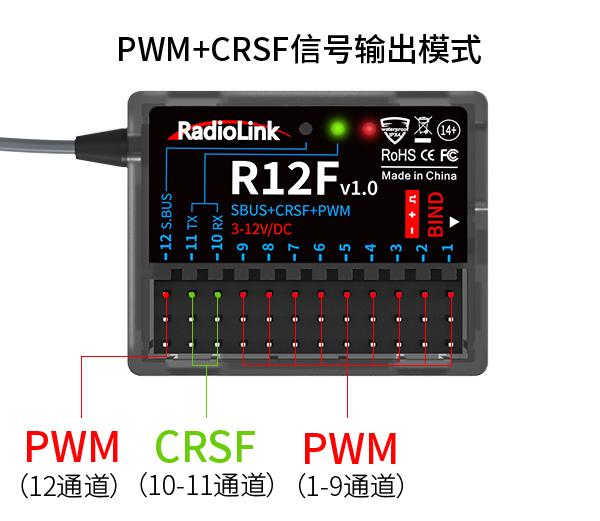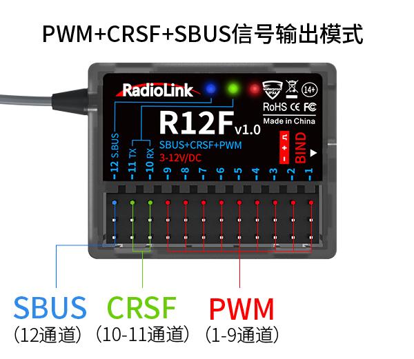 ③RX CRSF:当T12D上选择的FHSS V2.1接收机通信协议,R16F/R12F使用CRSF协议(绿灯)与飞控TELEM口连接时,选择则RX CRSF。