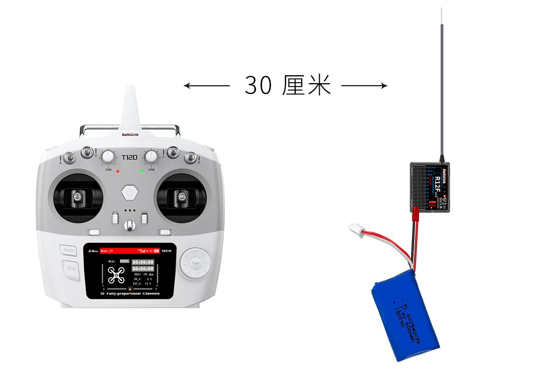 将高频头安装到T12D遥控器上,将T12D和接收机通电(接收机可连接至飞控TELEM回传口,将飞控通电)。