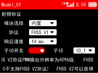 协议:接收机的协议。可选FHSS V1、FHSS V2和FHSS V2.1。