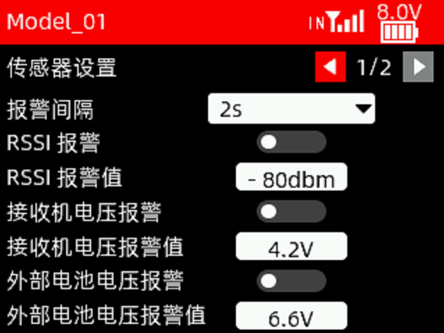传感器设置主要用于设置RSSI、接收机电压和外部电池电压的报警,和接收机及动力电压的校准。