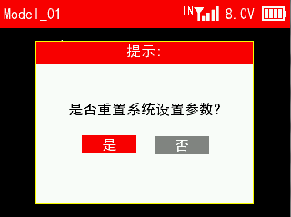 可重置遥控器的所有参数,包括系统设置参数和所有模型数据。
