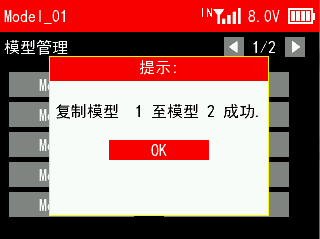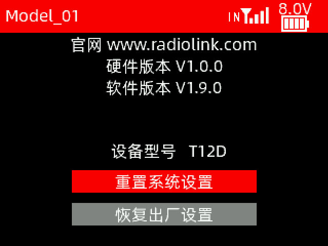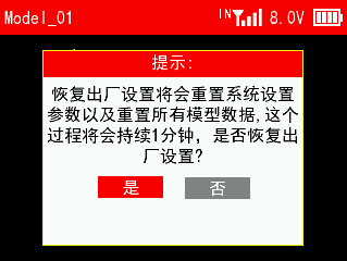注意:如果只是需要清除当前模型参数,请在遥控器设置--模型管理的界面重置当前模型即可。恢复出厂设置会清除所有的模型数据,模型数据清除后不可恢复,因此请谨慎使用此功能!