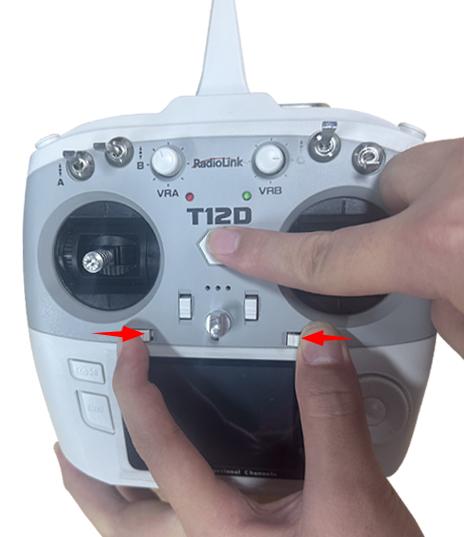 >将副翼微调和方向微调按键往中间推,同时长按遥控器的开机键,遥控器发出嘀嘀嘀的提示音即可松手;