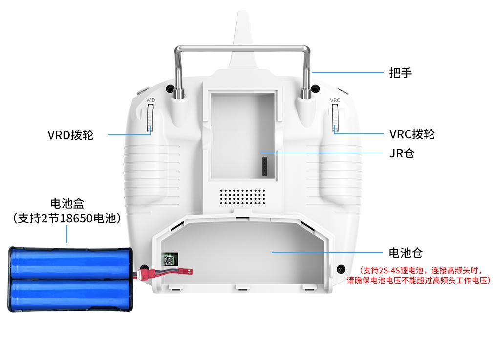 工作电压 | 7.4V-18V(支持8节5号电池,2S-4S锂电池或者18650锂电池。当遥控器连接高频头时,请确保给遥控器供电的电池电压不超过高频头的工作电压范围,否则会过压损坏高频头) |