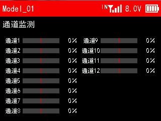 T12D开机后,在主界面下短按End键,进入通道监测快捷界面,再短按一次End键即可进入飞控信息回传界面(见下图)。
