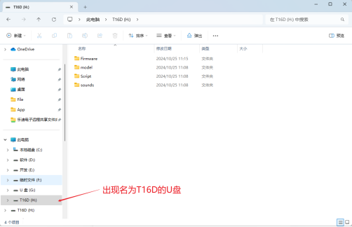 Click and enter USB MODE. The computer will display a removable disk of T16D. you can get 4 folders in it. (You can see 4 folders in the disk of T16D: Firmware, model, script, and sounds.)