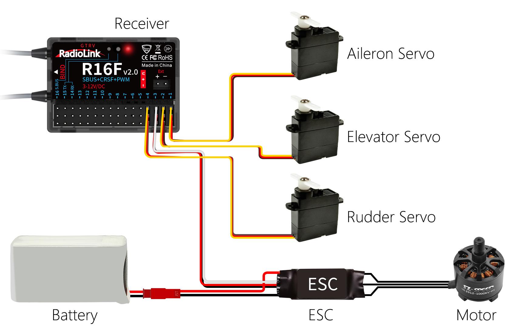 Note: RadioLink receivers are all designed with anti-polarity connect protection. When the receiver is powered by a separate battery, the receiver will not be damaged if the battery polarity is reversed, but if the servo is connected at this time, it will damage the servo.