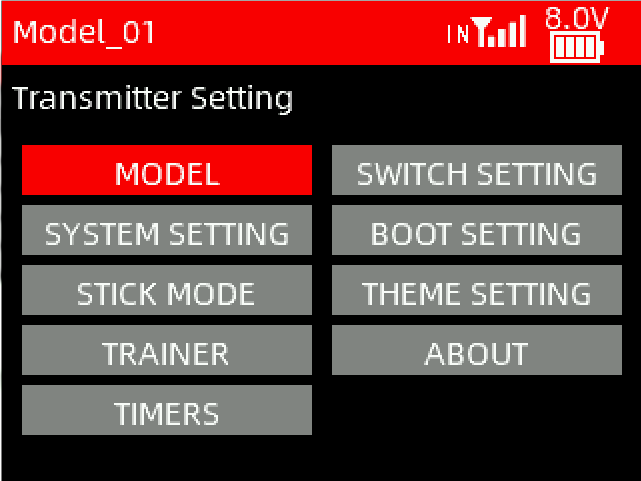 >Long press the power button to use the transmitter normally. You can check the current firmware version in Transmitter Settings--ABOUT menu interface to confirm that the firmware upgrade is successful.