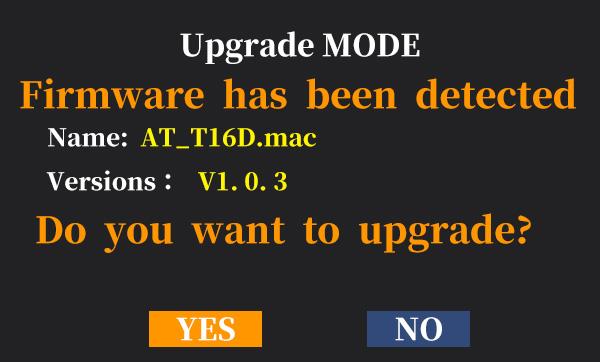 >The following Upgrade MODE interface will appear on the screen, indicating that it has entered upgrade mode. Select "YES" and press the Push button to confirm.