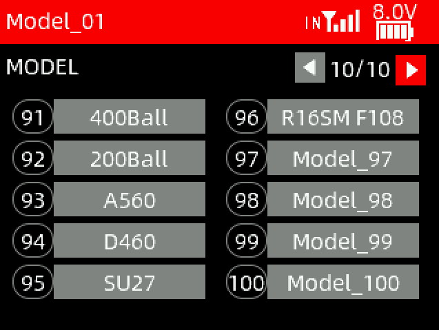 ① The name of the current model. You can select different models in Transmitter Settings - MODEL interface. T16D can support up to 100 sets of model storage. Before operating the model, be sure to check whether the model on the screen is consistent with the actual model used. If you select the wrong model, the movement, direction and neutral position settings of the servo will be wrong. Operating the remote control at this time may cause damage to the model.