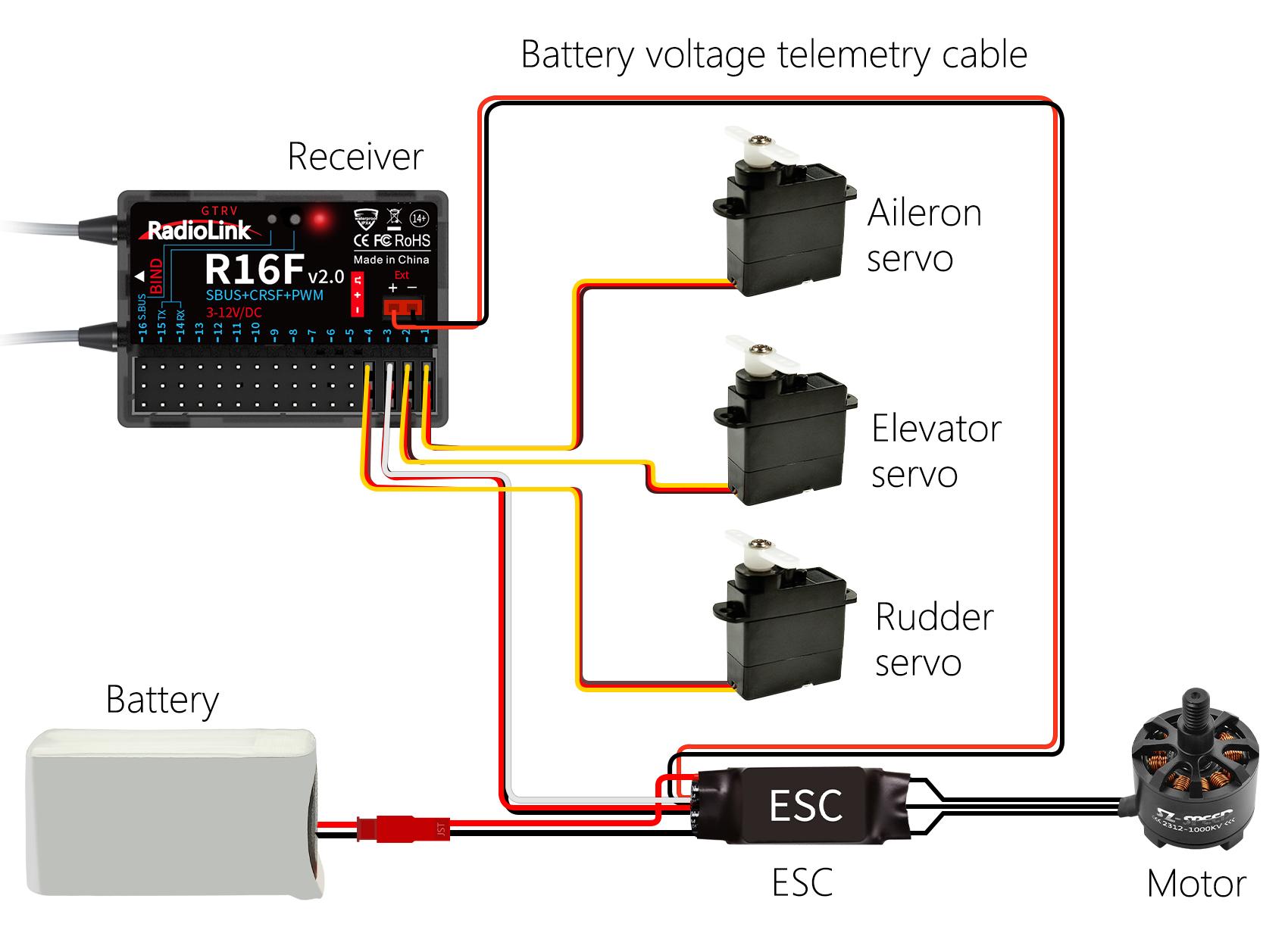 R16F supports telemetry of model battery voltage, receiver voltage and RSSI. Connect one end of the telemetry cable to the R16F telemetry port, and the other end to the ESC to return the power battery voltage. Please refer to the below picture for connection of the telemetry cable: