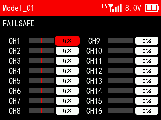 Fail safe is an important safety setting. When the signal is lost, it can be used to protect the model from loss or reduce the degree of loss. It can also play a certain protective role in personnel safety. This function sets the output value performed by each channel when the signal is lost. All channels default to 0% and can be customized according to the needs of the device.