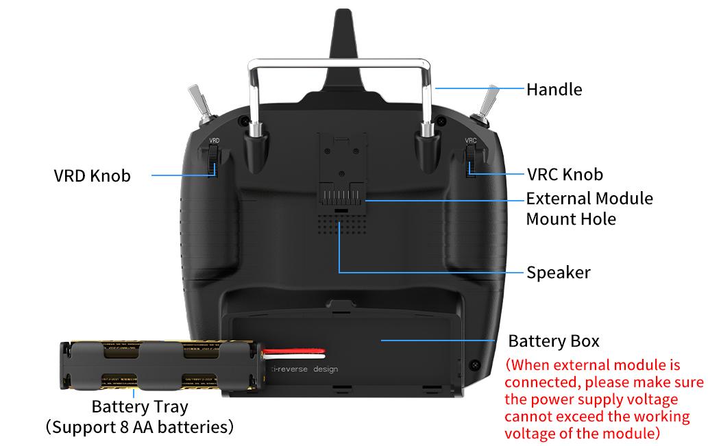 Transmitter low battery voltage alarm is 6.6V by default. If the battery voltage of transmitter is lower than 6.6V, T16D will make a voice broadcast to warn you the voltage is low. The battery voltage alarm value can be set based on the actual battery used.