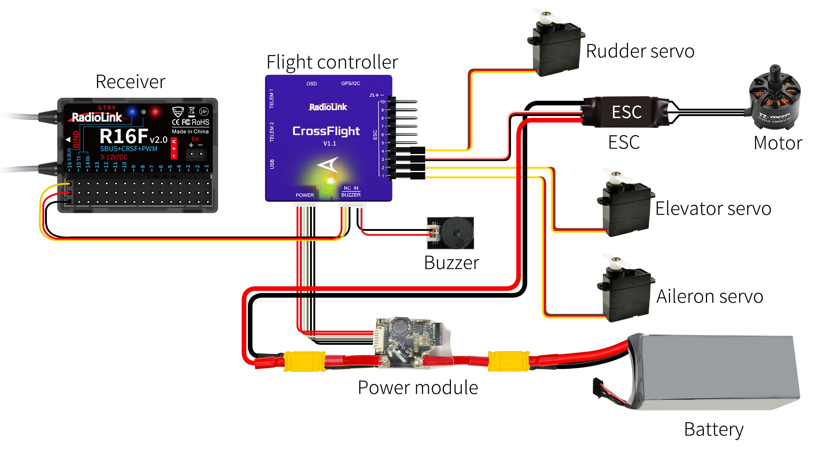 Switch the working mode of R16F to CRSF working mode and connect it to CrossFlight. Take TELEM1 as en example.