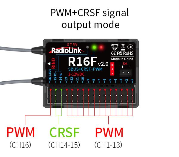R16F supports three signal outputs: PWM, SBUS and CRSF. It has four working modes in total.